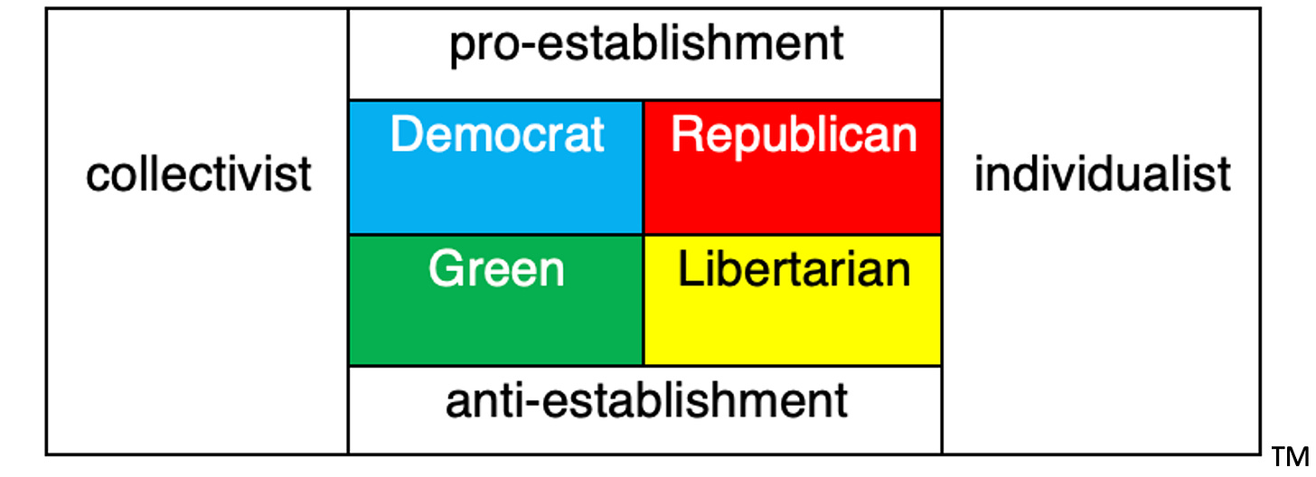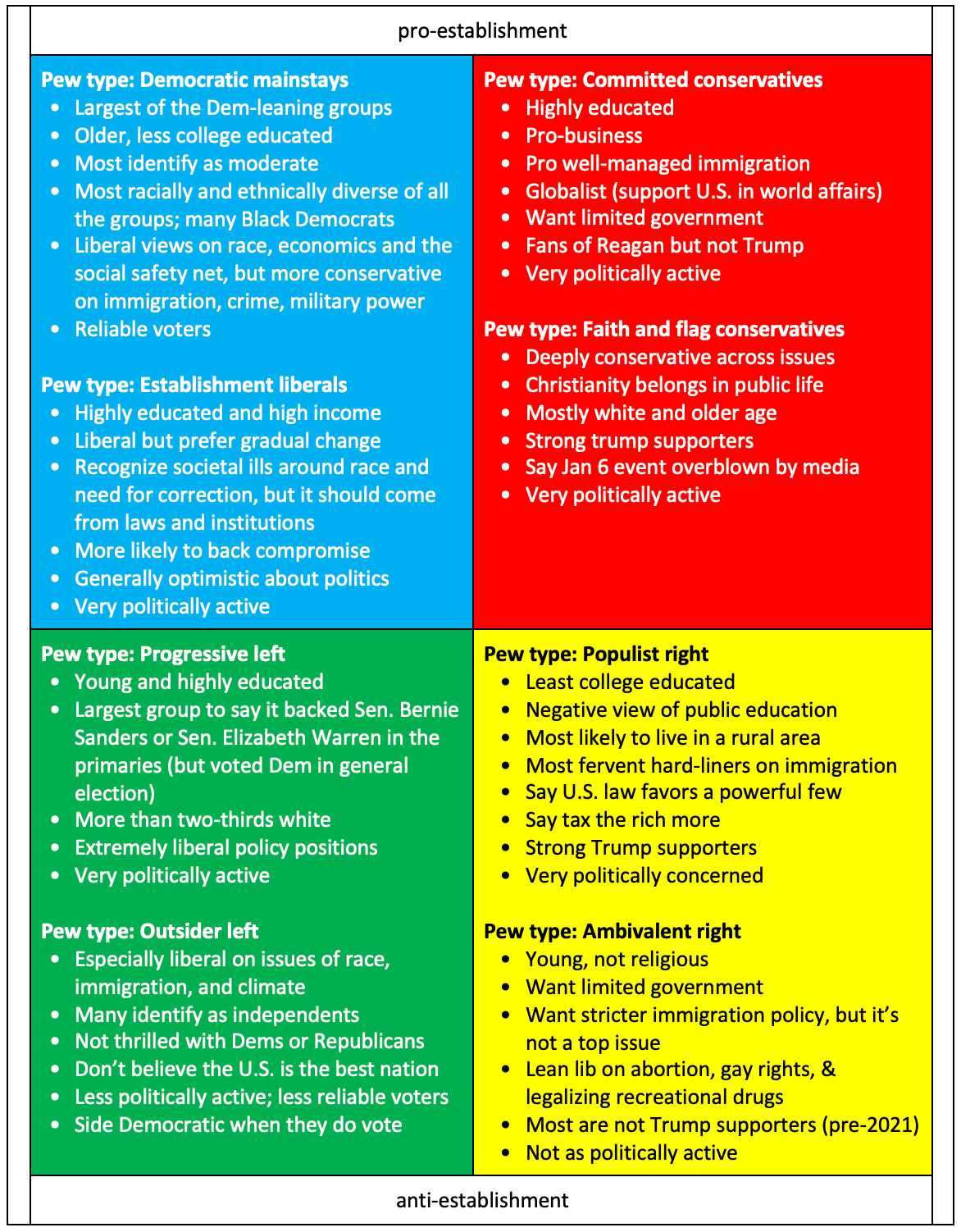 This section repeats the writing in the quadrants, for any who have difficulty reading in that format. Groups are presented in order of political party size. The top two quadrants are labeled pro-establishment and the bottom two, anti-establishment. What’s the benefit of the quadrant format? It’s a heuristic that can stick in the visual memory.